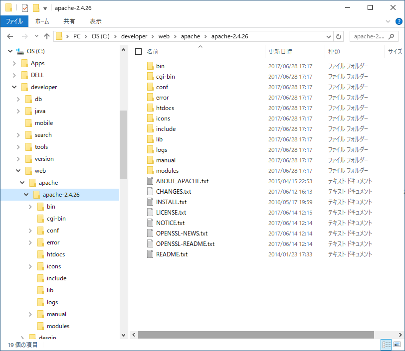 64bit版:「httpd-2.4.26-Win64-VC15.zip」 32bit版:「httpd-2.4.26-Win32-VC15.zip」