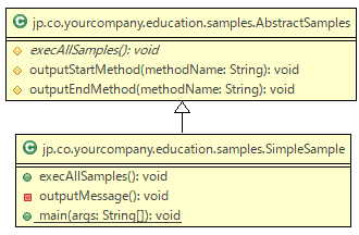 上記UMLのように、AbstractSampleクラスのexecAllSamples()メソッドが抽象メソッドになっています。
