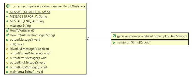 初めてのJavaで説明したJavaの基本スタイルのサンプルクラス「HowToWriteJava」クラスを親クラスとします。
