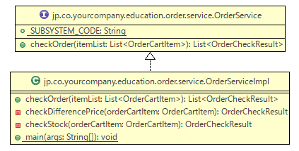 上記UMLのように、OrderServiceインターフェイスがcheckOrderメソッドを定義しているので、