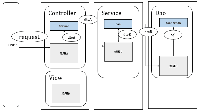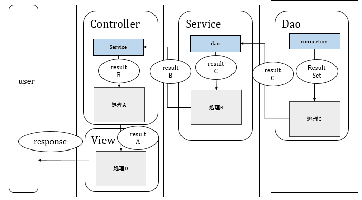 Controller,Service,Dao,dtoA,dtoB,sql,Connectionの計7つあります。
